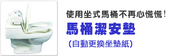 曾經是給人們生活上、尤其是給女性、孕婦、肥胖、年老弱者、殘障者、生病者、外國人帶來極大的方便。但是,隨著今日社會的高速發展,隨著人們生活水準的不斷提高,人們的衛生意識也不斷的提高,對日常生活、外出公共場所的衛生條件日益重視。傳統座式馬桶使用時、人體肌膚與座墊直接接觸,肌膚沾滿殘留在座墊上的尿液,汗液與及各種細菌,極為容易導致皮膚病、性病等各種疾病的交叉感染。且最近國內外權威機構及專家也證實了,SARS除通過呼吸道飛沫傳播以外,也可通過尿液、汗液傳播,而在公共場所使用傳統座式馬桶時,「座墊」----是通過尿液、汗液傳染疾病的最佳途徑。所以,傳統座式馬桶存在的衛生弊端,致使我們對座式馬桶的衛生問題存在著憂慮與畏懼。 而各個公共場所的負責人也非常重視座式馬桶的衛生問題,每天都有專人對座式馬桶進行清潔、消毒的措施。但是使用者對公共場所所採取的清潔措施並不領情,仍然解決不了對座式馬桶的恐懼,照樣不敢直接坐著使用座式馬桶。這是因為大家都在座同一個馬桶,都坐在同一塊座墊上,尤其是醫院、飯店、百貨公司,面對的都是各式各樣的人,廁所所有單位又不可能做到按每人每次使用後進行重新清潔、消毒,所以日常對馬桶的清潔措施,在沒有尋求到最佳解決方案之前,所謂的清潔、消毒只是退而求其次的作法,根本消除不了使用者對座式馬桶的恐懼心理。 以前,當我們要上廁所時,必須先將衛生紙擦拭馬桶墊的四周,或將座墊紙放於座墊上如廁,以免上面有殘留尿液、糞便或傳染性病菌,但都還覺得心裡毛毛的,因為還是有機會接觸與感染。盡量去找蹲式馬桶,但蹲式馬桶味道太重,不夠乾淨衛生,而且老年人、孕婦或殘疾人士及外國友人都不適不適合蹲式馬桶。 因此,有一項話時代的產品誕生了!這套機器名叫『馬桶潔安墊』,他是由馬達、電路板及一些IC測速器所組成,主機是由ABS所製,馬桶蓋及座墊由PP所製,能耐壓耐衝擊,使用不容易破壞。而PE紙捲是由0.28mm之PE塑膠所製,一捲可使用80人次,PE紙捲用過後仍然是一捲紙捲,只不過中間已被劃破,防止第二次使用。不會像普通的一次性廁紙墊用後,散落一地遍地狼籍,而每機組可附送PE紙捲2捲。 你只要輕輕一按,座墊上的PE紙捲自動為您換上全新的座墊紙,不需您親自擦拭替換。而且他將由左側走到右側走一圈,完全的更換全新的一次性的PE紙捲,原理是靠右側馬達的動力,捲入舊的捲軸。他只需10秒鐘就能將之前使用過的PE紙捲換成新的PE紙捲,現在您可安心的坐下使用,確保您使用的乾淨衛生。